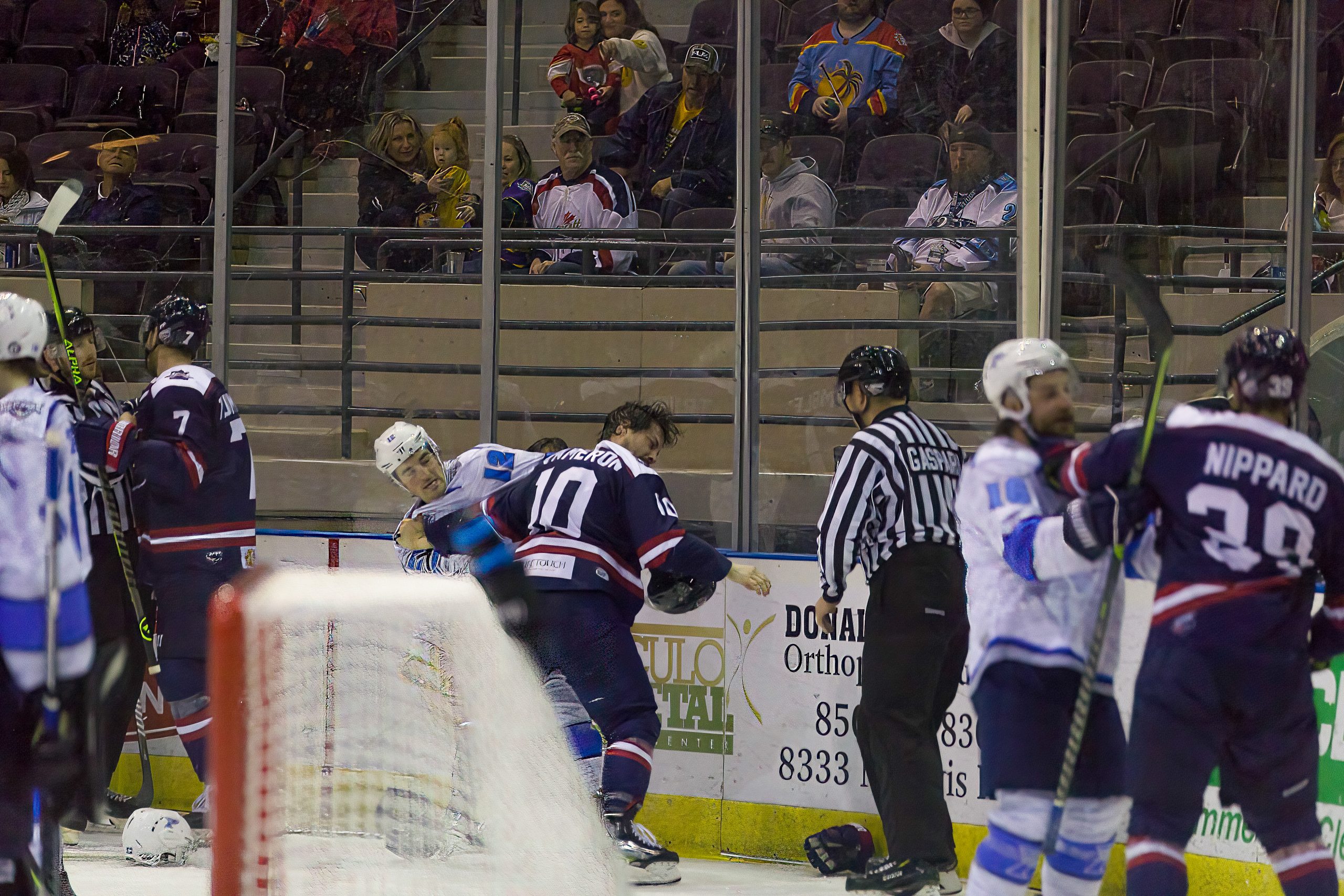 Mitch Atkins began the goal barrage by deflecting home an inside blue line wrist shot by Branden Makara, following a faceoff in the Macon zone. Just 15 seconds later, it was 2-0 when Nick Leitner took a perfect pass from Garrett Milan and finished it into the net.