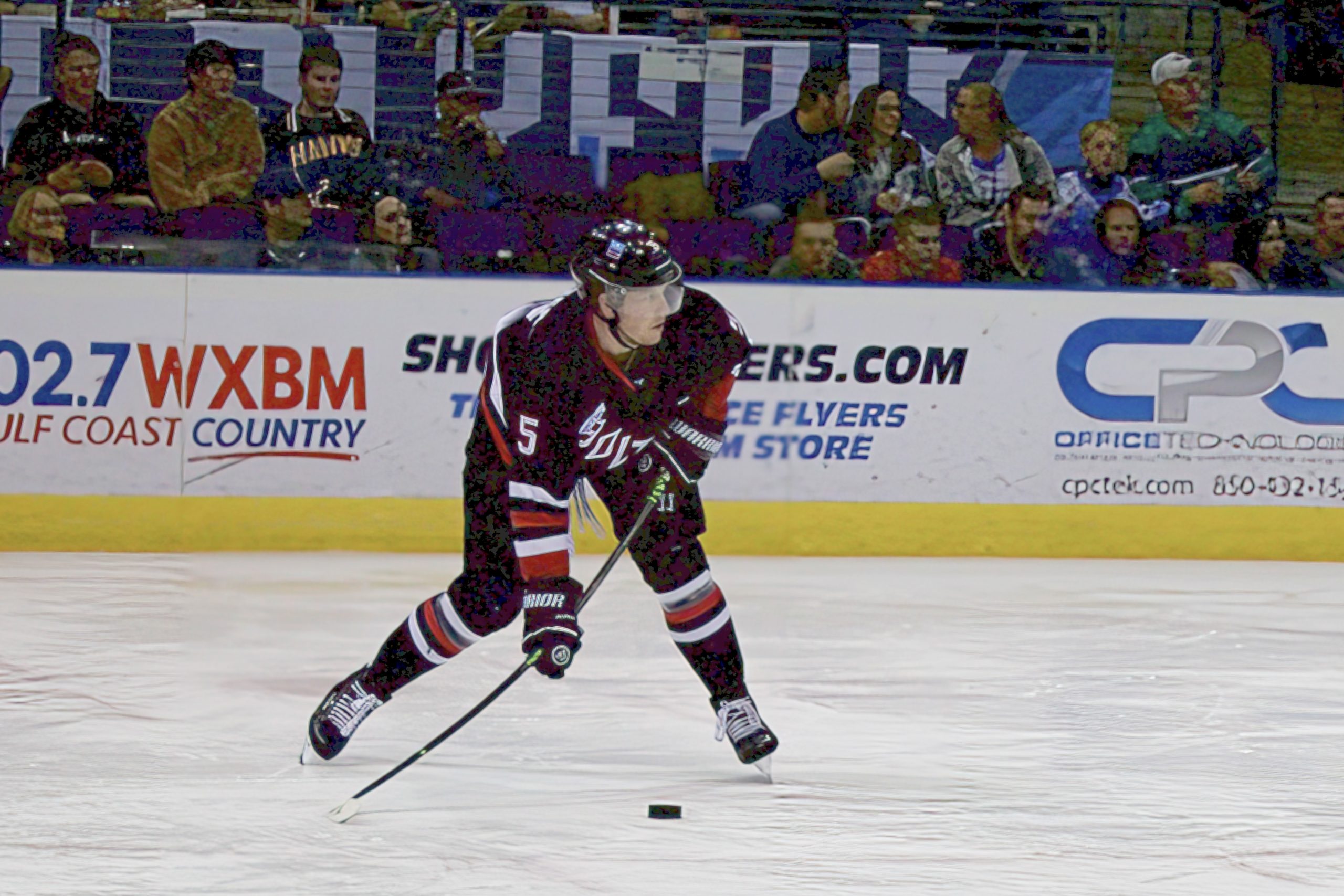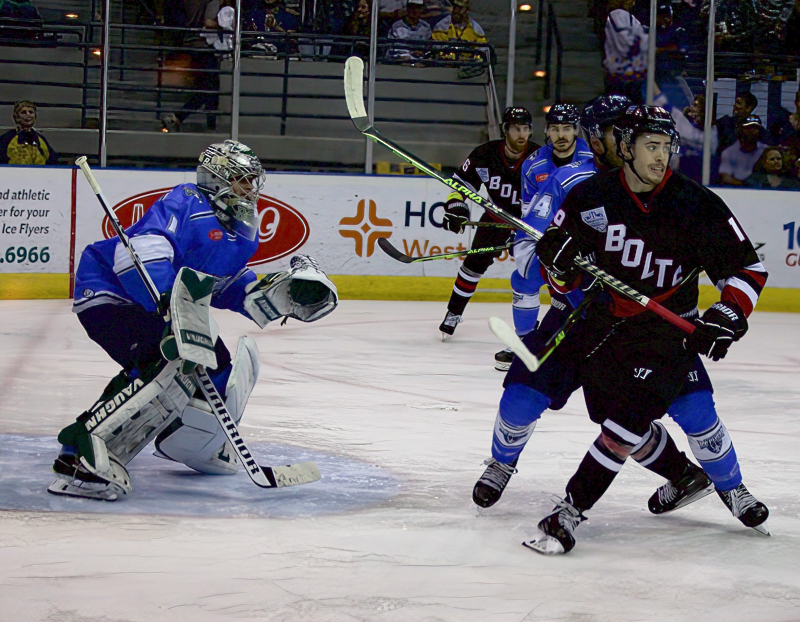 After taking a first intermission lead, then tying the game before the second period break, the Ice Flyers managed only seven shots in the final period and fell 4-2 against the Evansville Thunderbolts as the teams began a set of three consecutive games at the Pensacola Bay Center.