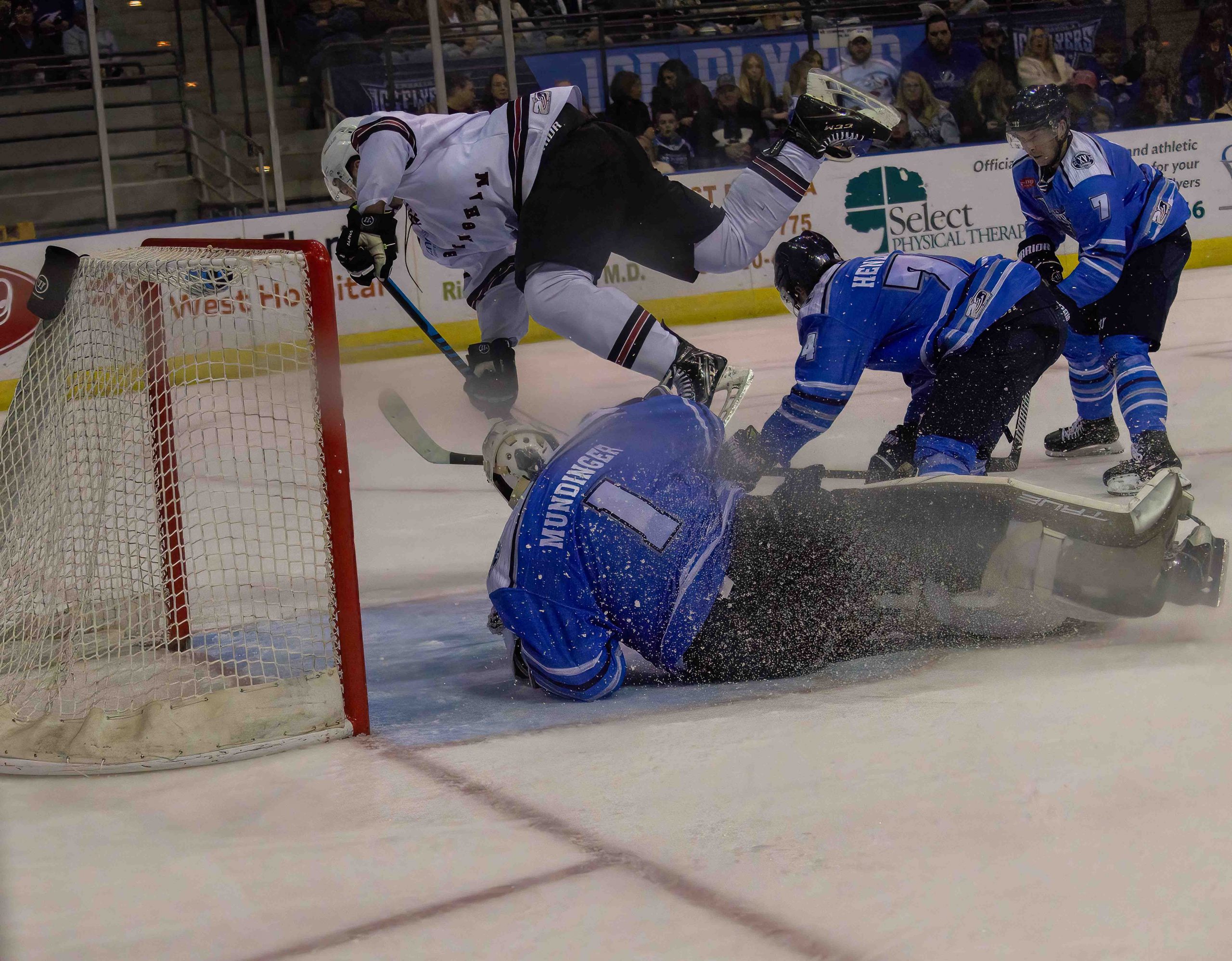 Birmingham scored the game’s first goal five minutes earlier when Scott Donahue poked in a loose puck that had fallen off Mundinger’s chest amid a player scramble in the crease area.
