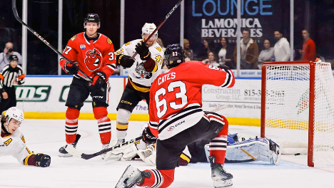 The IceHogs punched right back converting off a Wolves turnover down low. Räty stole the puck away and fed Cates by the back door to tap in his second of the game. Less than a minute later, Cates snagged the hat trick, blasting in his third from the slot for a 4-2 lead.