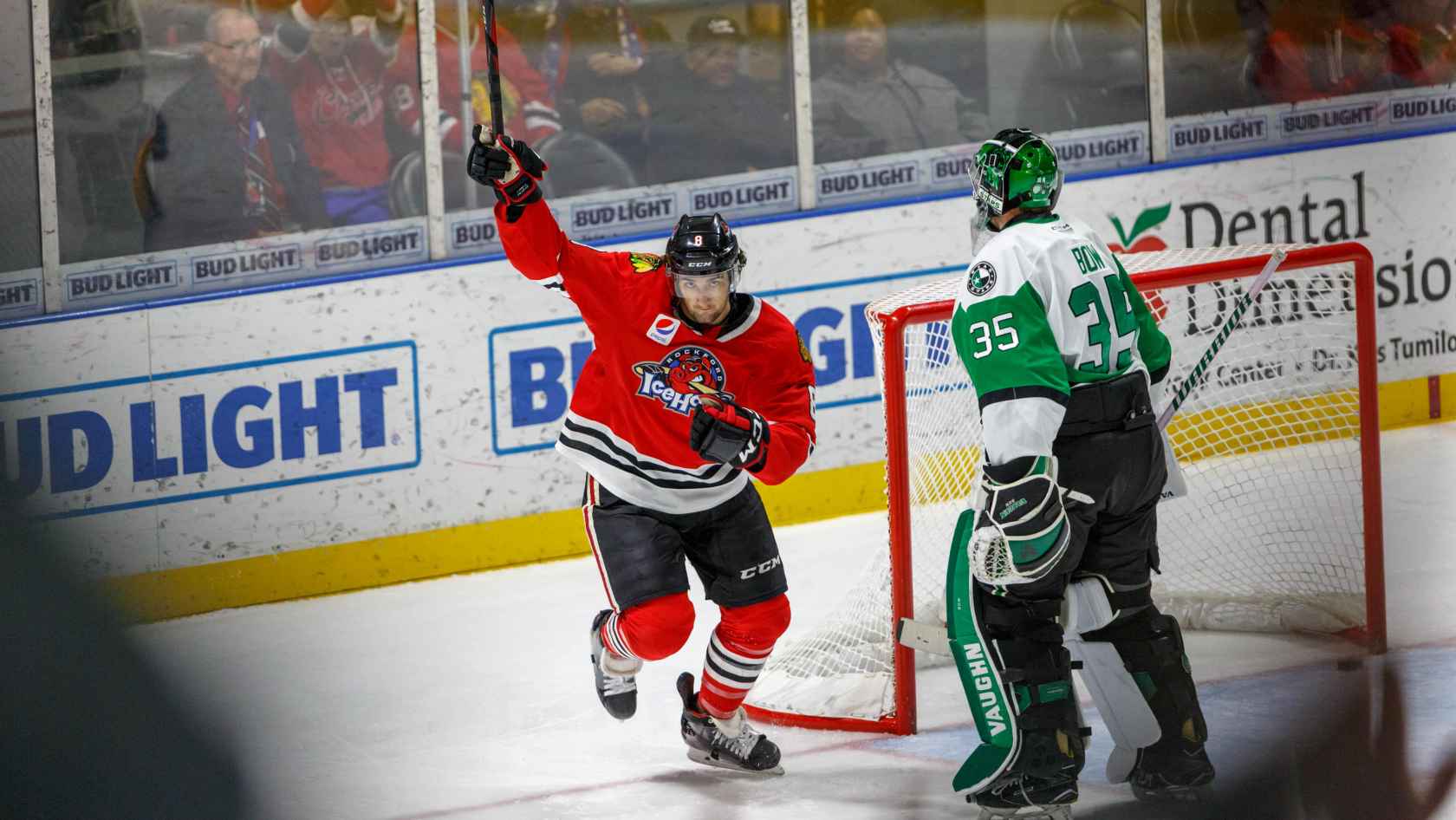 Rockford jumped out to an early 2-0 lead when Dylan Sikura and John Quenneville tucked home tallies in the first 5:58 of the opening frame. Sikura broke the scoreless tie when he and his brother, Tyler Sikura, broke into the Stars zone on an odd-man rush. The two exchanged passes before Tyler set Dylan up for a one-timer that Dylan blasted through Texas netminder, Jake Oettinger.