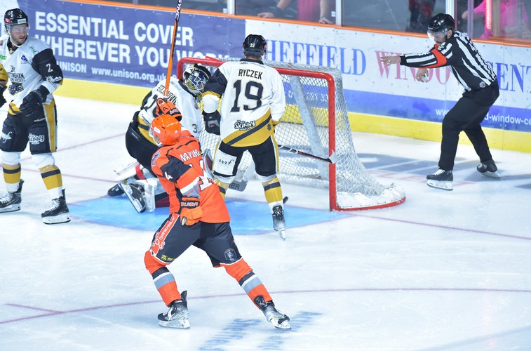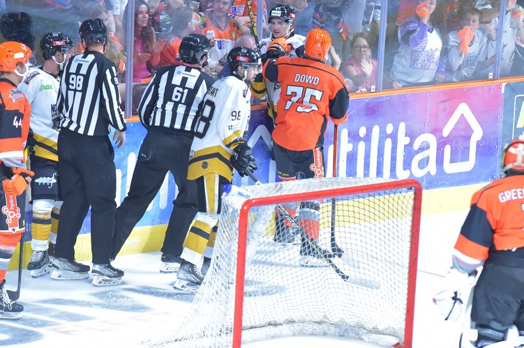 The Steelers then dominated the third period with two further goals, accompanied by the gloves being dropped by Ciampini, Tansey, Jones and Dowd.