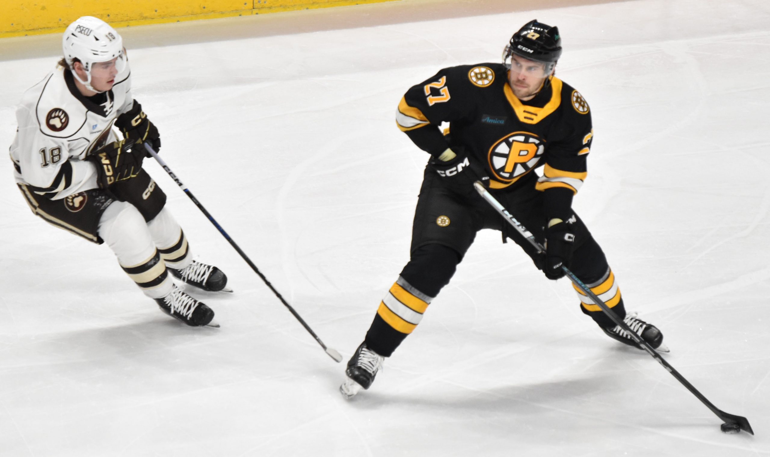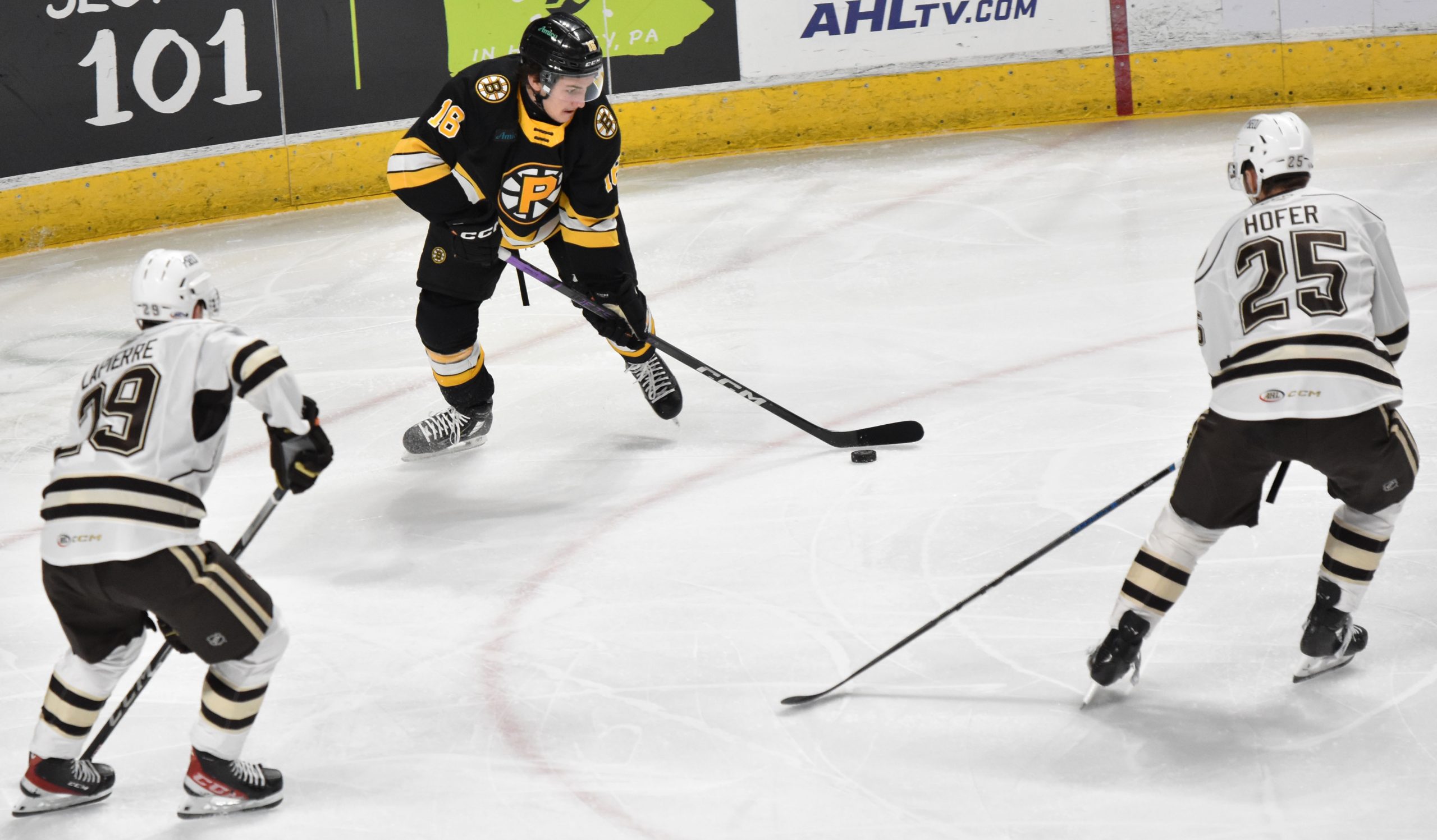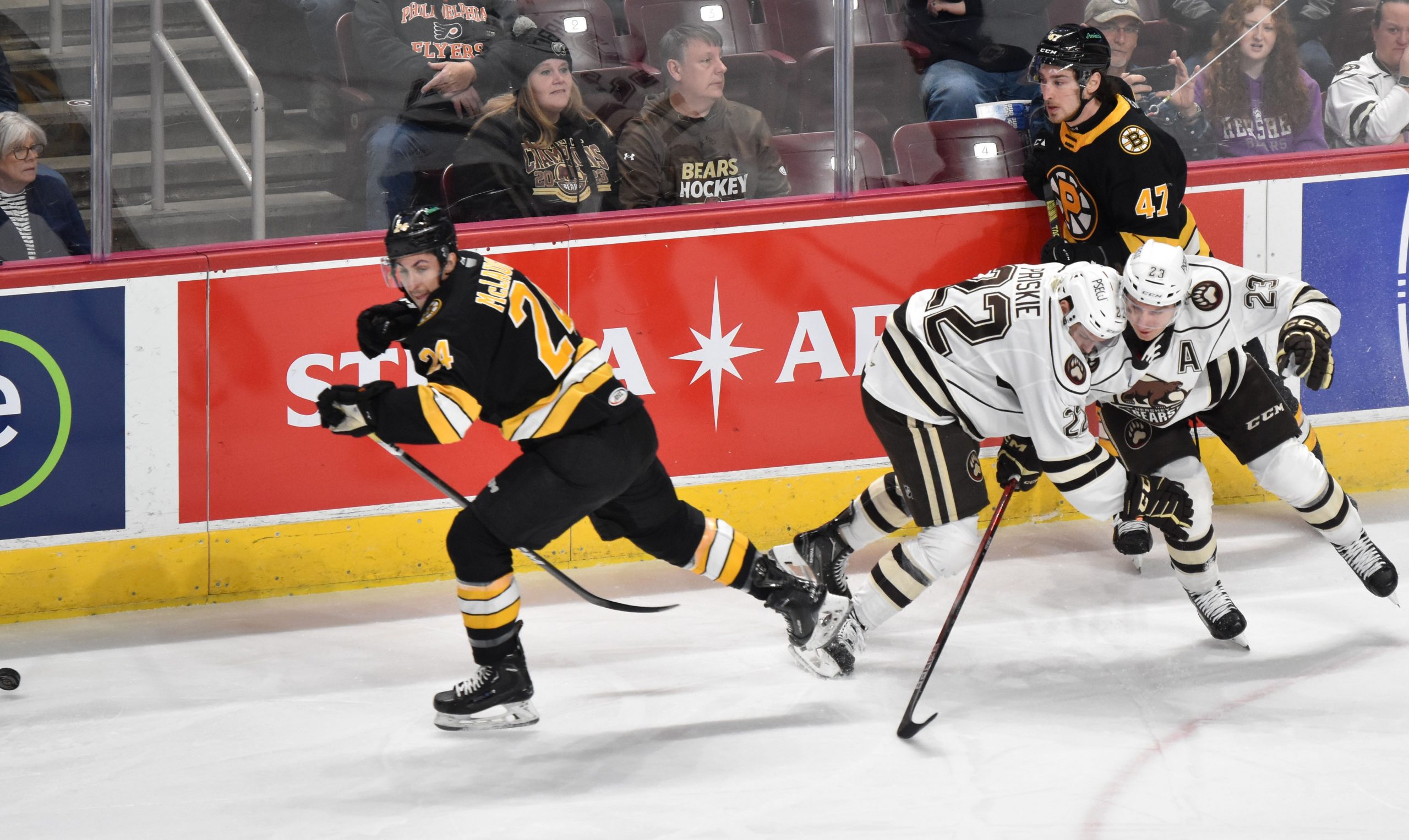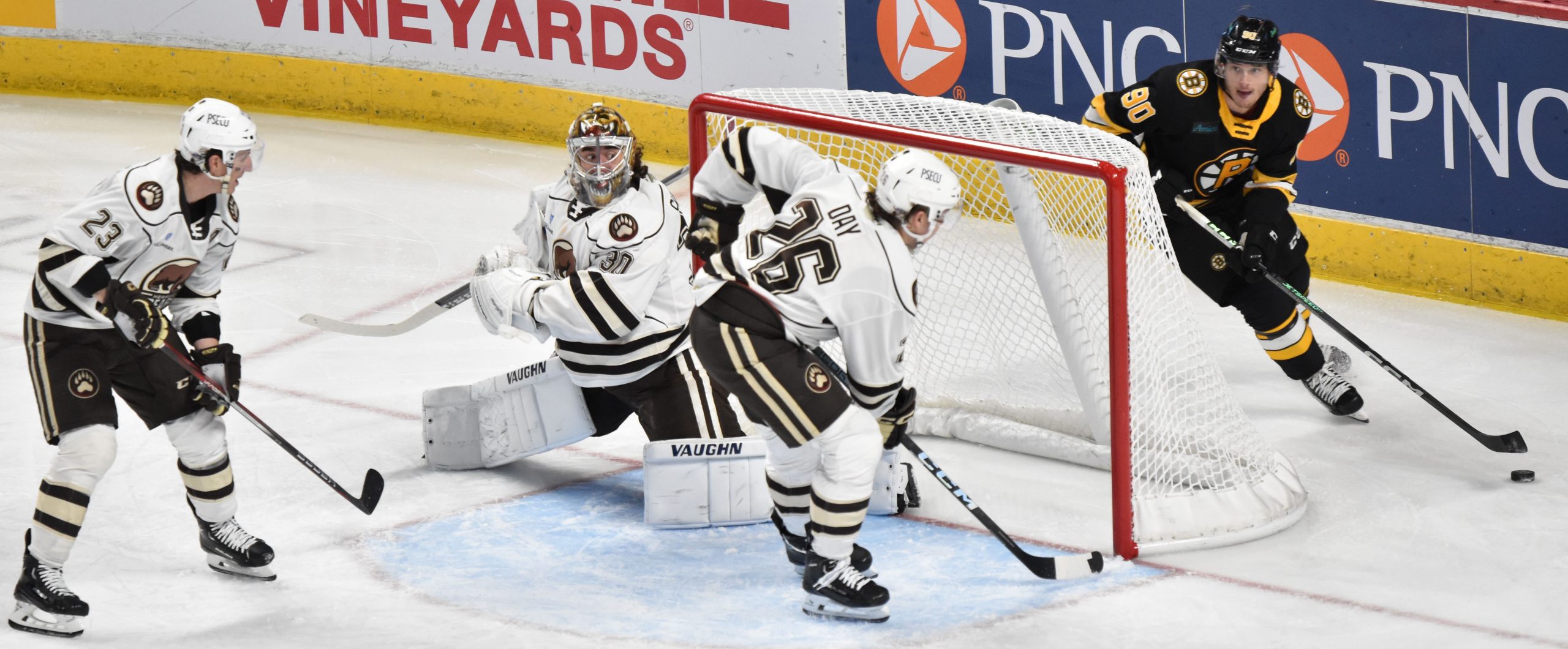 The Bears claimed the game late in the extra frame when a backchecking Ethen Frank managed to recover the puck from a Providence skater in the Hershey zone and move it along to Sgarbossa, who curled back inside the defensive zone and set a pass up the right side into neutral ice for Iorio, who broke in with Frank on a 2-on-1, before snapping the puck past Bussi at 3:48 to end the match with his third goal of the season.
