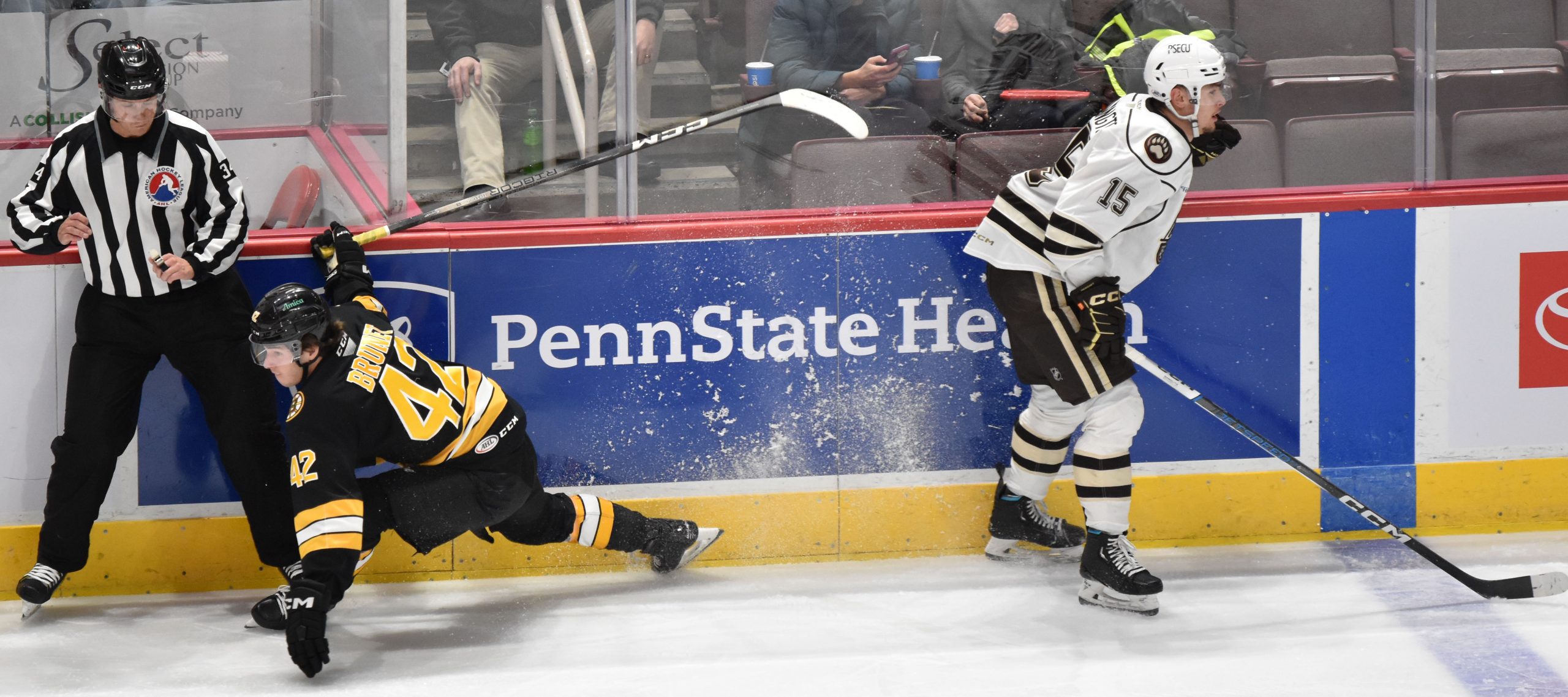 Pierrick Dube leveled the score for Hershey at 6:38 of the third period with a power-play goal. As Mike Sgarbossa and Logan Day passed the puck back-and-forth above the right circle, Dube settled into the slot before receiving a pass from Sgarbossa and putting his 13th of the season past Bussi to make it 2-2 and force overtime.