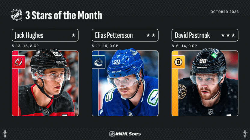 NEW YORK — New Jersey Devils center Jack Hughes, Vancouver Canucks center Elias Pettersson and Boston Bruins right wing David Pastrnak have been named the NHL’s “Three Stars” for the month of October.
