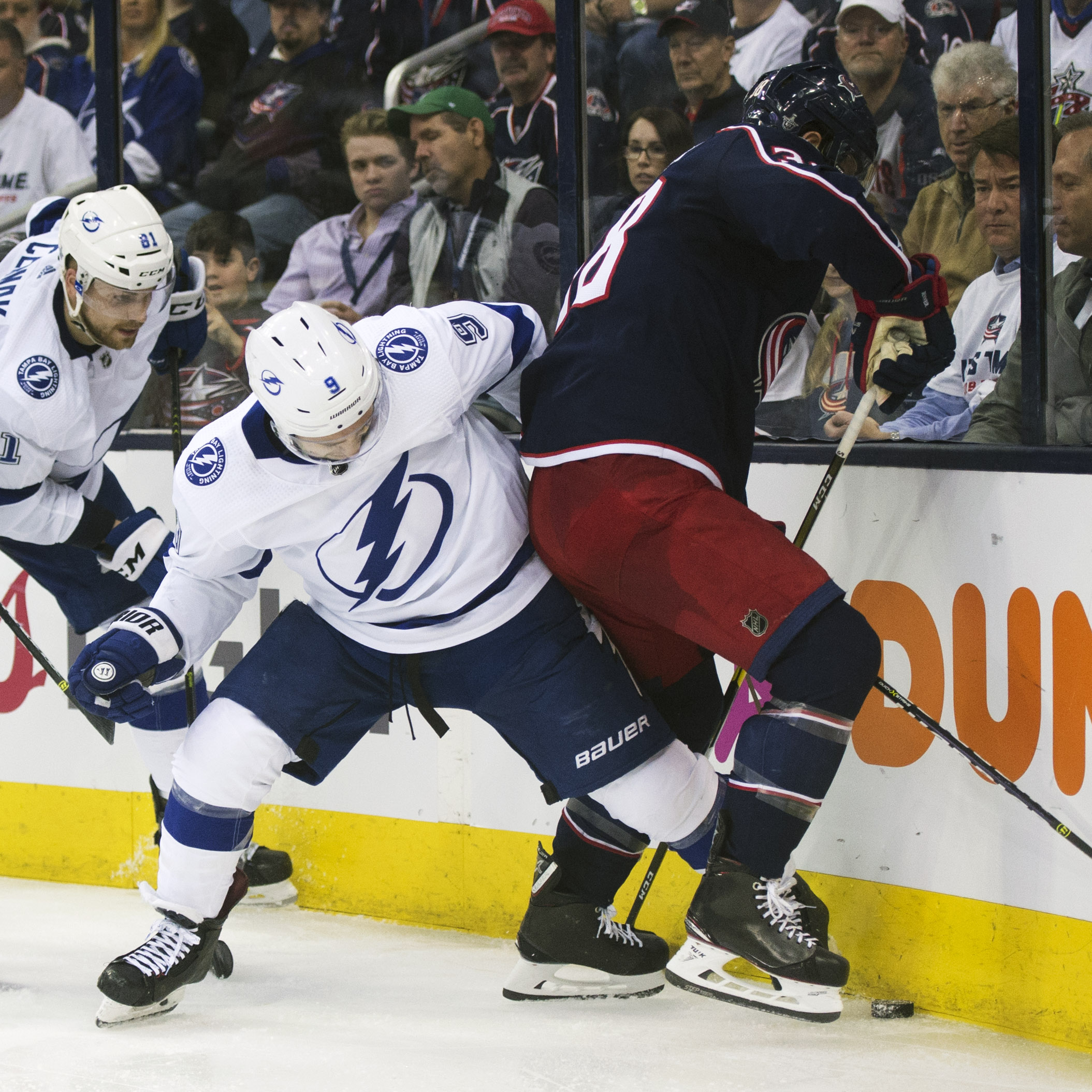 April 14, 2019: Columbus Blue Jackets defenseman Zach Werenski (8) handles the puck against Tampa Bay Lightning center Anthony Cirelli (71) in their game in Columbus, Ohio. Brent Clark/Pro Hockey news