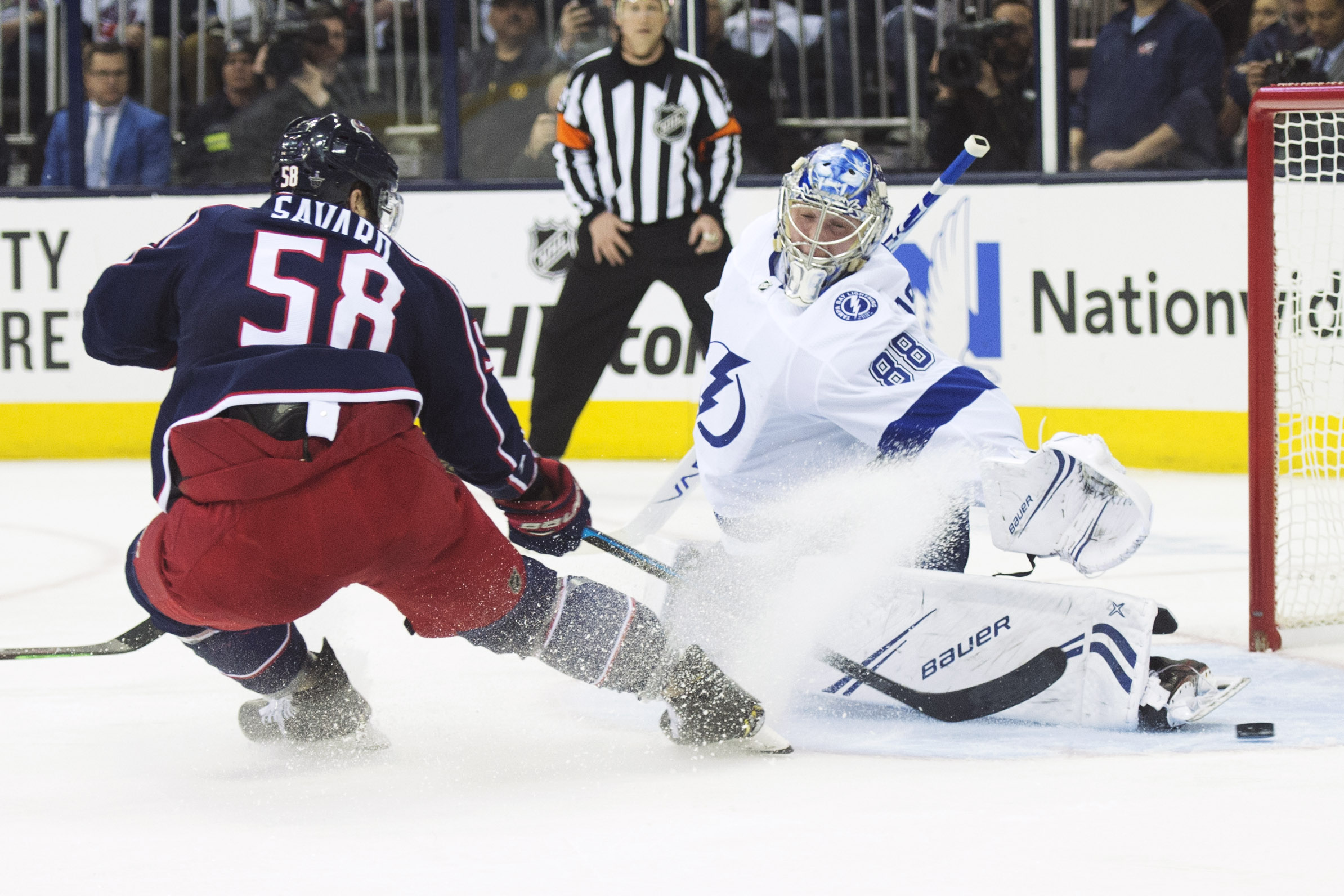 April 14, 2019: Tampa Bay Lightning goaltender Andrei Vasilevskiy (88) makes the save against Columbus Blue Jackets defenseman David Savard (58) in their game in Columbus, Ohio. Brent Clark/Pro Hockey news