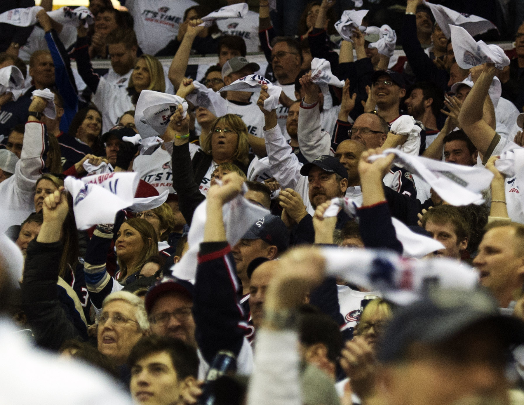 April 14, 2019: Columbus Blue Jackets fans cheer their team on against the Tampa Bay Lightning in their game in Columbus, Ohio. Brent Clark/Pro Hockey news