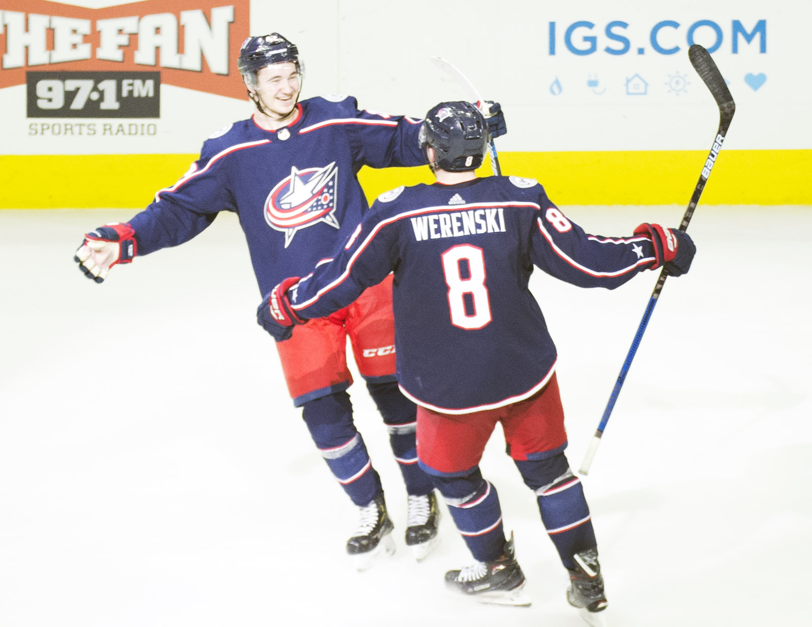 April 14, 2019: Columbus Blue Jackets center Alexandre Texier (42) celebrates his goal against Tampa Bay with Columbus Blue Jackets defenseman Zach Werenski (8) in their game in Columbus, Ohio. Brent Clark/Pro Hockey news