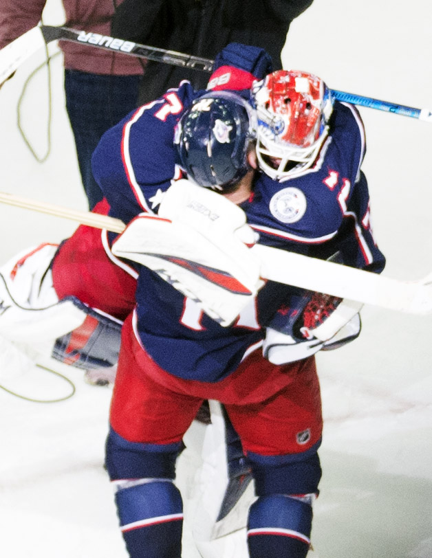April 14, 2019: Columbus Blue Jackets goaltender Sergei Bobrovsky (72) and Columbus Blue Jackets left wing Nick Foligno (71) embrace after defeating the Tampa Bay Lightning 7-3 in their game in Columbus, Ohio. Brent Clark/Pro Hockey news