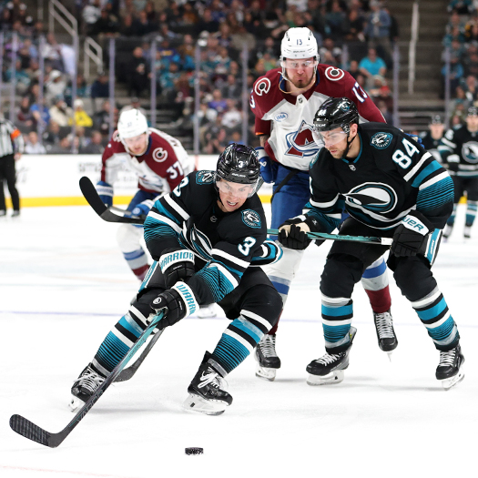 Sharks defenseman Henry Thrun (3) chases down the puck in front of Jan Rutta (84) and Valeri Nichushkin (13) – Photo by Jack Lima
