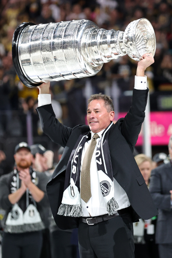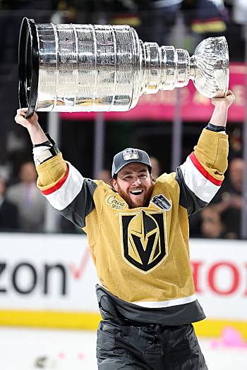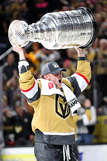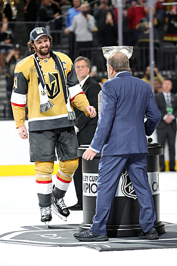 NHL Commisioner Gary Bettman awards the Stanley Cup to Golden Knights Captain Mark Stone