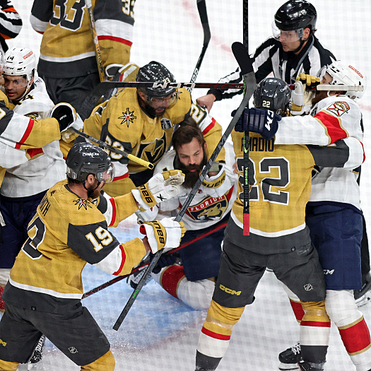 Alec Martinez (23) grabs Raadko Gudas (center) in the middle of a scrum Published June 14, 2023 at 525 × 525 in Knights truly Golden, win Stanley Cup in Game 5 rout Alec Martinez (23) grabs Raadko Gudas (center) in the middle of a scrum – Photo by Jack Lima