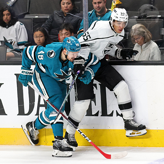 Sharks defenseman Nikita Okhotiuk (83) checks Quinton Byfield (55) into the boards as they fight for the puck – Photo by Jack Lima
