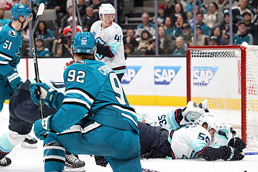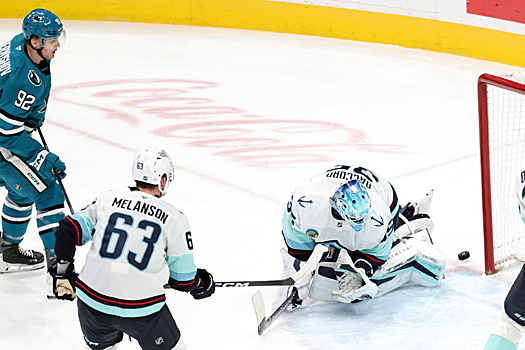 Kraken goalie Joey Daccord gets ready the block the puck as Sharks forward Igor Chernyshov (92) looks for a rebound – Photo by Jack Lima