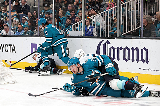 Sharks Sam Dickinson (6) and Vincent Iorio (22) battle Jani Nyman (38) and Ryan Winterton (26) for the puck behind the net – Photo by Jack Lima