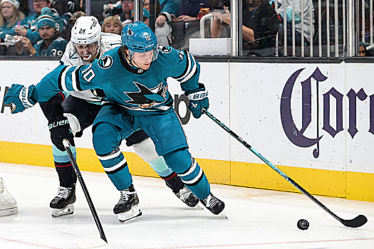 Sharks center Ty Dellandrea (10) moves the puck around the net as Marty Beniers (10) applies pressure – Photo by Jack Lima
