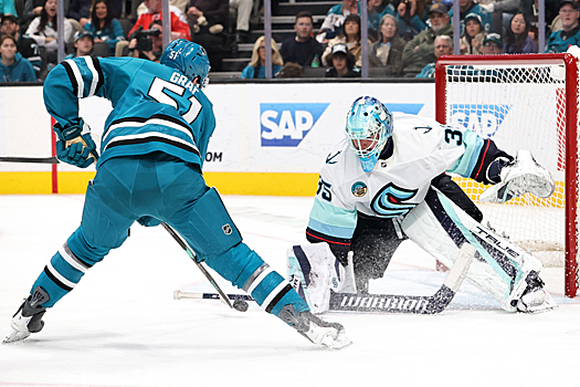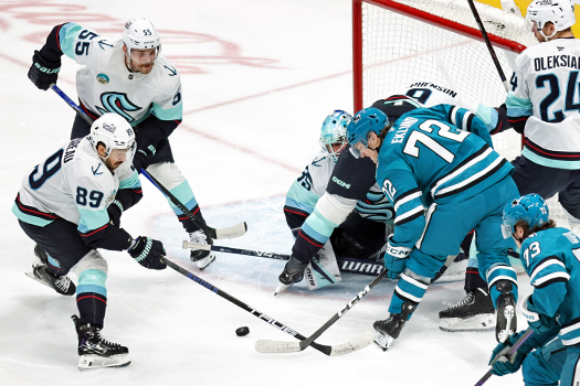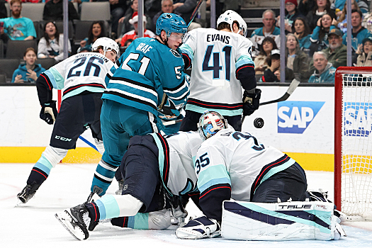 Sharks forward Collin Graf (51) looks for the rebound after his shot on goal was stopped by Kraken goalie Joey Daccord – Photo by Jack Lima