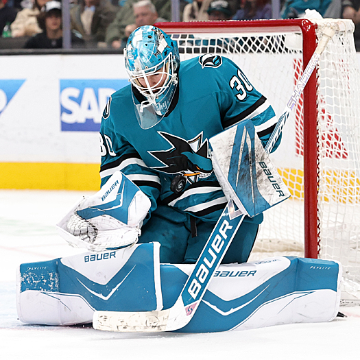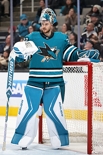 Sharks goalie Yaroslav Askarov takes a shot to the stomach during third period action – Photo by Jack Lima