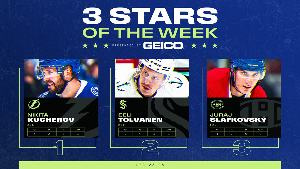 NEW YORK (– Tampa Bay Lightning right wing Nikita Kucherov, Seattle Kraken right wing Eeli Tolvanen and Montreal Canadiens left wing Juraj Slafkovský have been named the NHL’s “Three Stars” presented by GEICO for the week ending Dec. 28.