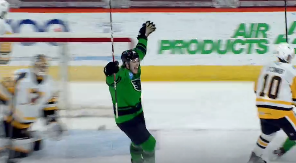 Johnathan Gruden tripped up Zayde Wisdom with just 1:15 left giving the Phantoms a glorious chance in the final moments but the Penguins preserved the tie into overtime and killed the rest of the man advantage at the beginning of the extra period as well. Play had just resumed to 4-on-4 when Pouliot connected on a lead pass to Laczynski who maybe didn’t get all of is shot from the top of the left circle in beating Starrett towards the glove side for the winning tally.