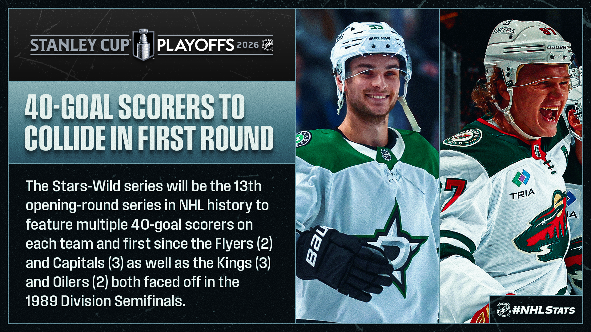 The NHL’s first 2026 Stanley Cup Playoffs matchup to be confirmed will finally come to fruition when a pair of 40-goal teammates go head-to-head as Jason Robertson (45), Wyatt Johnston (45) and the Stars host Kirill Kaprizov (45), Matt Boldy (42) and the Wild for Game 1 of their First Round series at American Airlines Center.