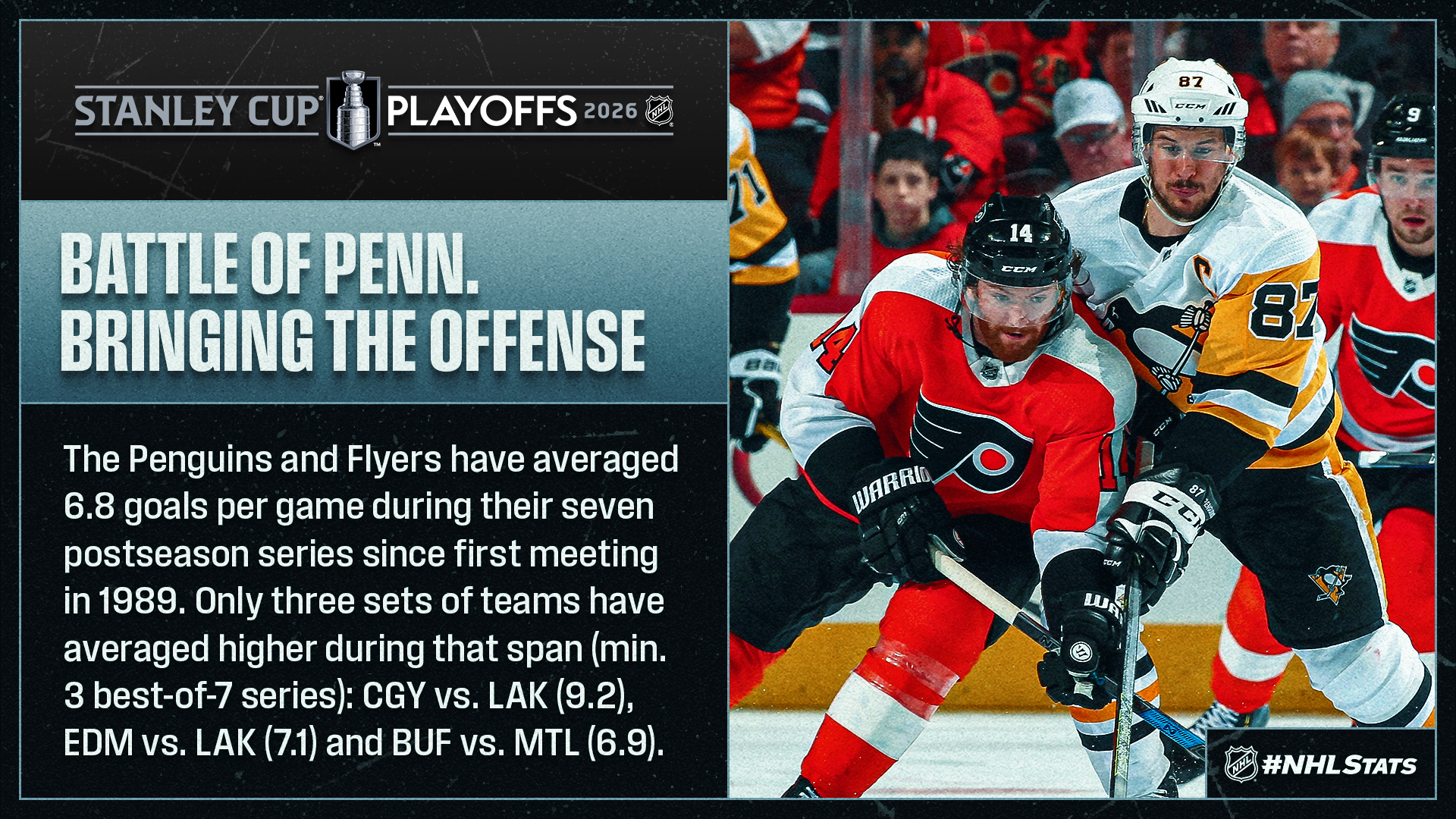 The iconic trio of Sidney Crosby, Evgeni Malkin and Kris Letang begin their quest for a fourth Stanley Cup championship and will do so against a familiar foe when Sean Couturier, Travis Konecny and Trevor Zegras visit PPG Paints Arena for Game 1 of their First Round series – the eighth rendition of the “Battle of Pennsylvania” and first since the 2018 First Round. The winner of the previous seven all-time series between the rivals has gone on to reach the Stanley Cup Final on three occasions.