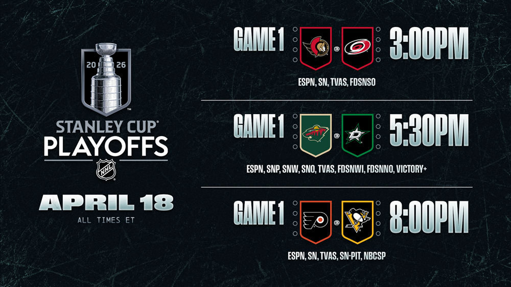 * A trio of Game 1s on the opening day of the 2026 Stanley Cup Playoffs begin with the first-ever playoff series between Carolina-Ottawa, Central Division rivals facing off with multiple 40-goal scorers on either side in the Dallas-Minnesota series and the first “Battle of Pennsylvania” in eight years between Pittsburgh-Philadelphia.