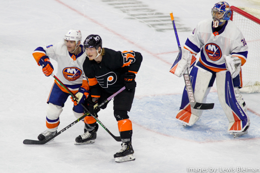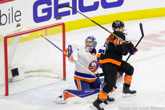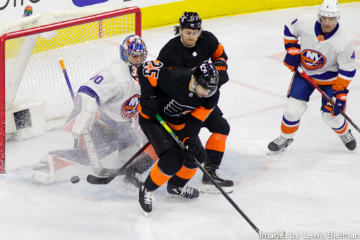 Scott Laughton #21 of the Philadelphia Flyers chases the puck over Ilya Sorokin #30 and Andy Greene #4 of the New York Islanders
