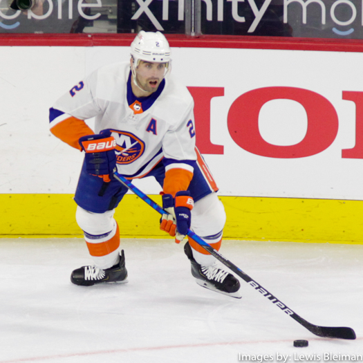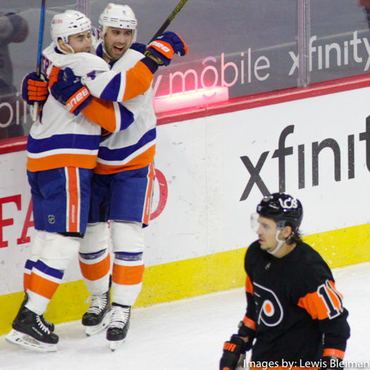 New York Islanders Nick Leddy #2 and Jordan Eberle #7 celebrate beating the Philadelphia Flyers in the overtime period.The loss hurt the Flyers’ chase for fourth playoff spot in the east division.