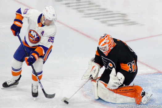 Brock Nelson #29 of the New York Islanders shot is blocked by Brian Elliott #37 of the Philadelphia Flyers