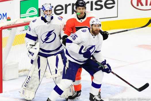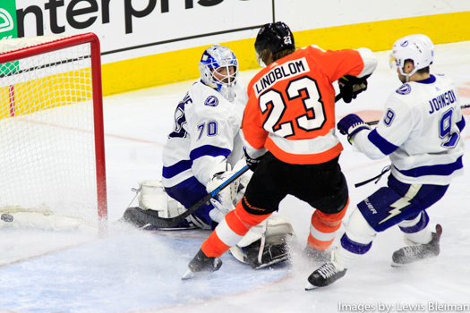 Tampa Bay Lightning Louis Domingue (#70), Left Wing James van Riemsdyk (#25) of the Philadelphia Flyers, Defenseman Braydon Coburn (#55) of the Tampa Bay Lightning