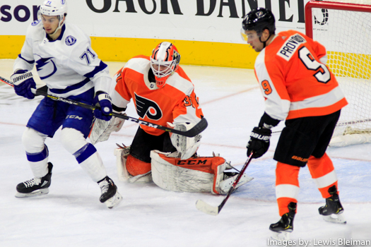 Center Anthony Cirelli (#71) of the Tampa Bay Lightning, Goalie Brian Elliott (#37) and Defenseman Ivan Provorov (#9) of the Philadelphia Flyers