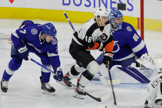 Morgan Frost #48 of the Philadelphia Flyers looks for a shot to tip past Andrei Vasilevskiy #88 of the Tampa Bay Lightning