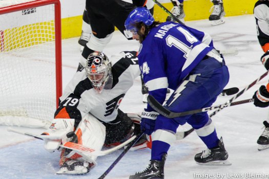 Carter Hart #79 of the Philadelphia Flyers makes a stick save on Pat Maroon #14 of the Tampa Bay Lightning
