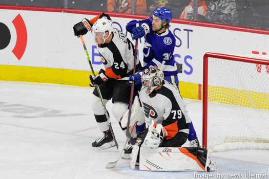 Carter Hart #79 and Ivan Provorov of the Philadelphia Flyers #9 and Pat Maroon #14 of the Tampa Bay Lightning