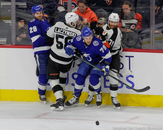 Ian Cole #28 and Ross Colton #79 of the Tampa Bay battle Philadelphia Flyers Tanner Laczynski #58 and Max Willman #71