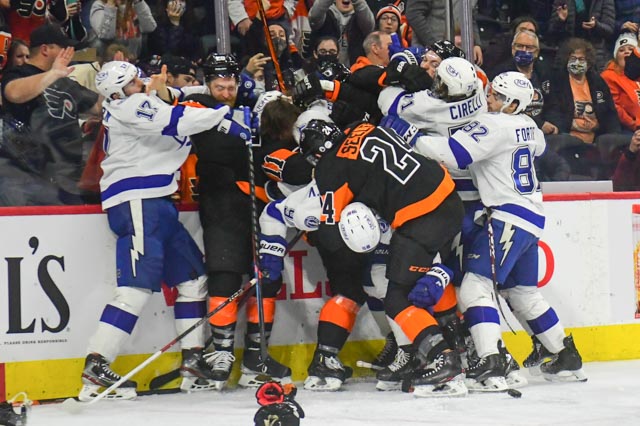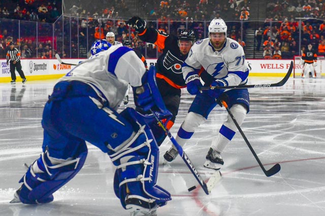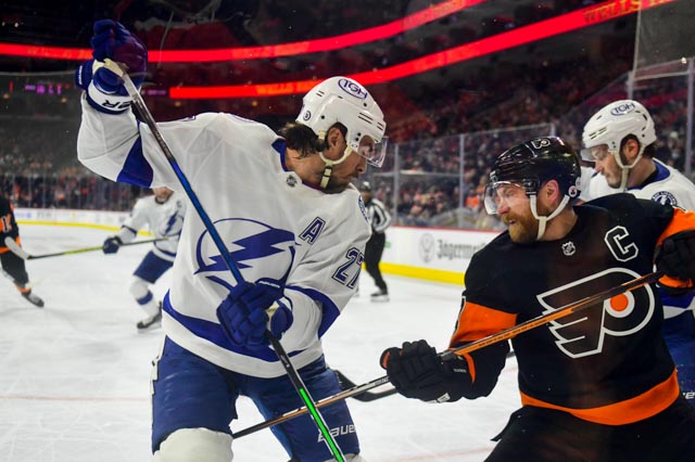 PHILADELPHIA — Corey Perry hit for a pair of goals and three points on Sunday, in a 7-1 shelling of the Flyers by the Tampa Bay Lightning.