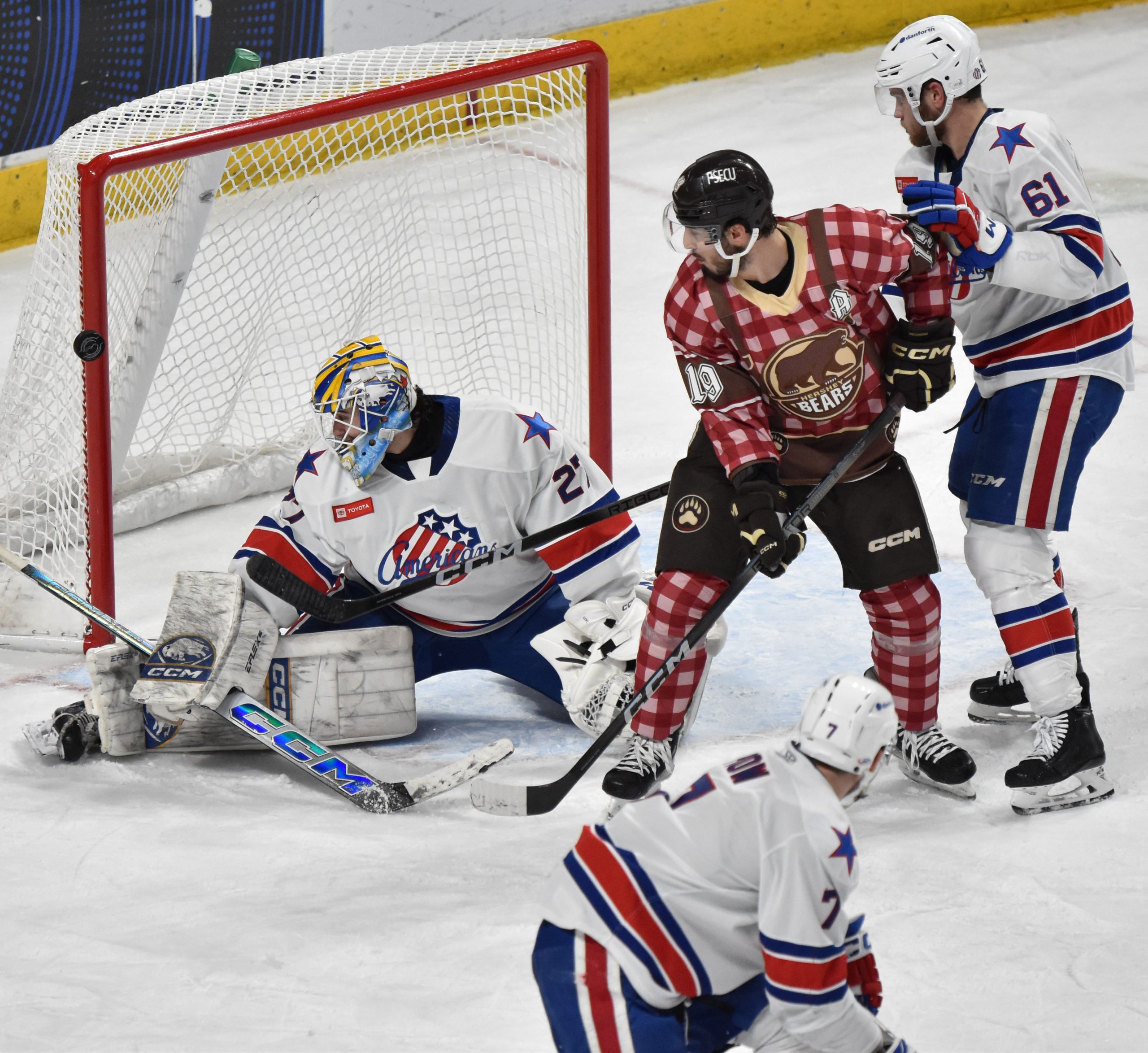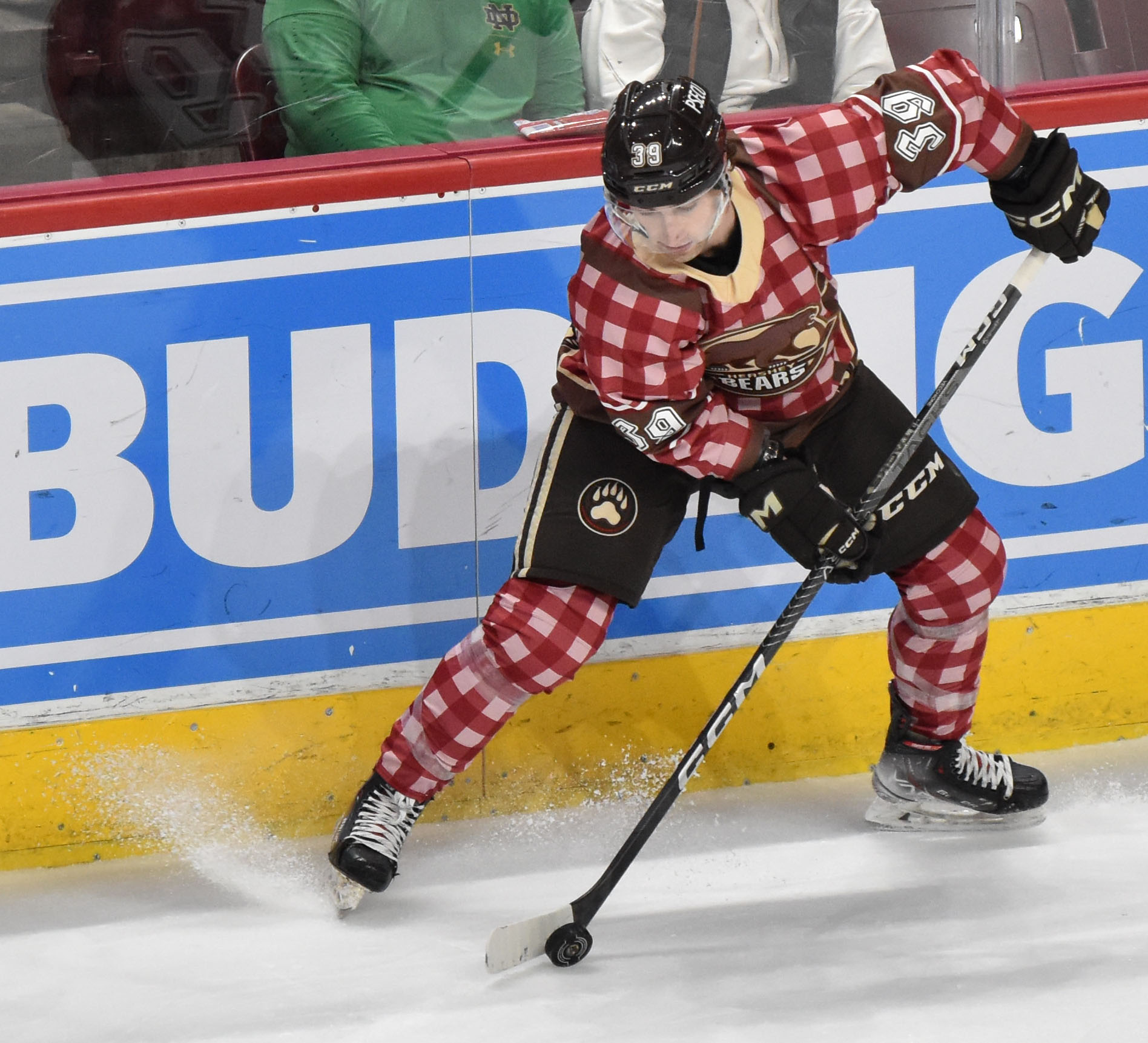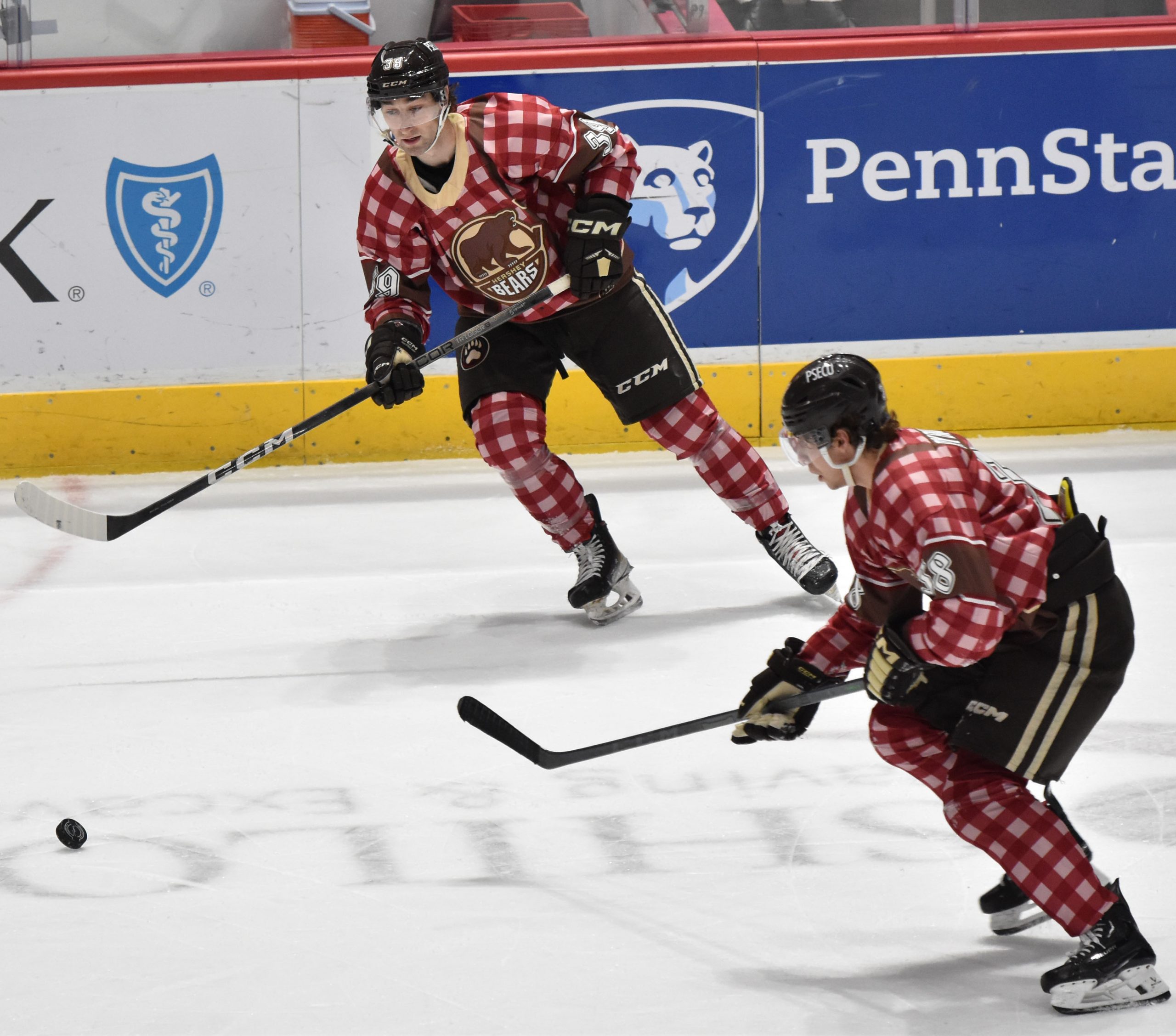 The Bears leveled the score at 2:38 of the second period when Bogdan Trineyev ripped a shot from the left circle into the top-left corner of the net of Devon Levi for his eighth of the season. The goal marked Trineyev’s third consecutive game with a goal. Chase Priskie and Kevin O’Neil assisted on the tally; it was the first point of the season with Hershey for O’Neil.