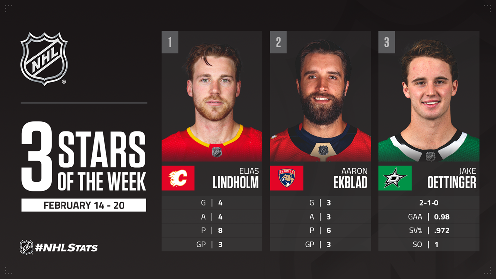 NEW YORK – Calgary Flames center Elias Lindholm, Florida Panthers defenseman Aaron Ekblad and Dallas Stars goaltender Jake Oettinger have been named the NHL’s “Three Stars” for the week ending Feb. 20.