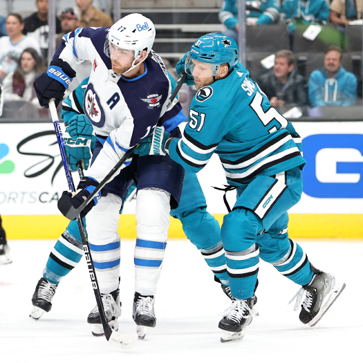 Adam Lowry (17) attempts to control a pass in front of Sharks defenseman Radim Simek (51) – Photo by Jack Lima
