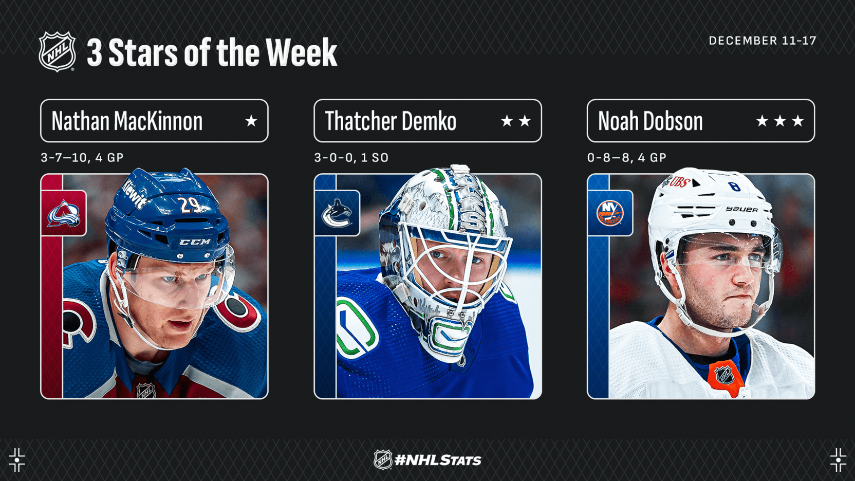 NEW YORK – Colorado Avalanche center Nathan MacKinnon, Vancouver Canucks goaltender Thatcher Demko and New York Islanders defenseman Noah Dobson have been named the NHL’s “Three Stars” for the week ending Dec. 17.