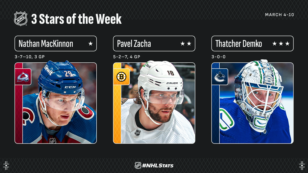 NEW YORK – Colorado Avalanche center Nathan MacKinnon, Boston Bruins center Pavel Zacha and Vancouver Canucks goaltender Thatcher Demko have been named the NHL’s “Three Stars” for the week ending March 10.