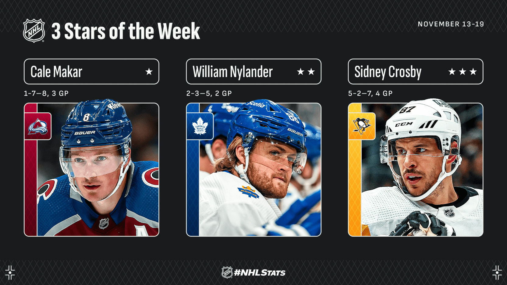 NEW YORK — Colorado Avalanche defenseman Cale Makar, Toronto Maple Leafs right wing William Nylander and Pittsburgh Penguins center Sidney Crosby have been named the NHL’s “Three Stars” for the week ending Nov. 19.