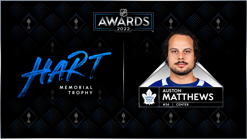 TAMPA, Fla.– Center Auston Matthews of the Toronto Maple Leafs is the 2021-22 recipient of the Hart Memorial Trophy, presented “to the player adjudged to be the most valuable to his team,” as selected by the Professional Hockey Writers Association.  leafs