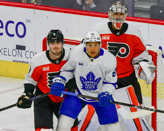 Jamie Drysdale #9 of the Philadelphia Flyers battles Dakota Joshua #81 of the Toronto Maple Leafs in front of goalie Dan Vladar #80 of the Philadelphia Flyers