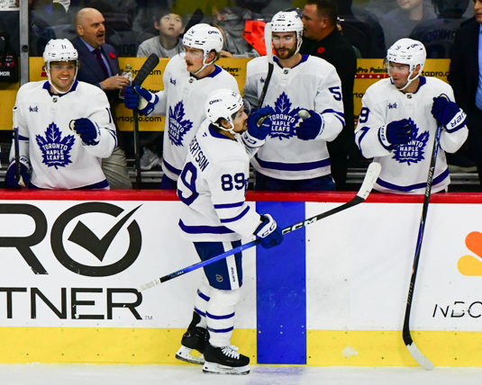 NHL 2025_11_01 Philadelphia Flyers vs Toronto Maple Leafs Published November 2, 2025 at 535 × 428 in Maple Leafs hang 5-2 loss on Flyers Nicholas Robertson #89 of the Toronto Maple Leafs receives congratulations from teammates for his goal in the second period.