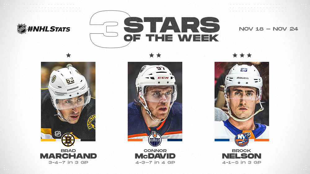 NEW YORK – Boston Bruins left wing Brad Marchand, Edmonton Oilers center Connor McDavid and New York Islanders center Brock Nelson have been named the NHL’s “Three Stars” for the week ending Nov. 24.
