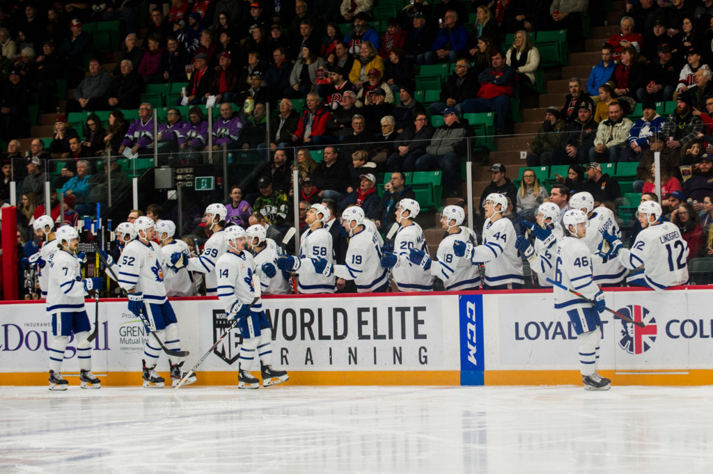 Filip Chlapik extended the Senators’ lead to 3-1 with a goal at 2:31 of the second period. At 7:28, Garrett Wilson and Darren Archibald converted on a give and go to bring the Marlies back within one. The goal kick started a scoring frenzy as the Marlies potted five more unanswered goals. At 12:52 of the second period, Belleville’s Chlapik and Jack Dougherty took simultaneous penalties, giving the Marlies a two-man advantage. Toronto capitalized early into the power play as Timothy Liljegren buried a one-timer to even the score 3-3. Shortly after, Jeremy Bracco sent Nic Petan in alone and he made no mistake restoring the Marlies’ lead with his third of the season. The three-goal period put the Marlies ahead 4-3 heading into the final frame.