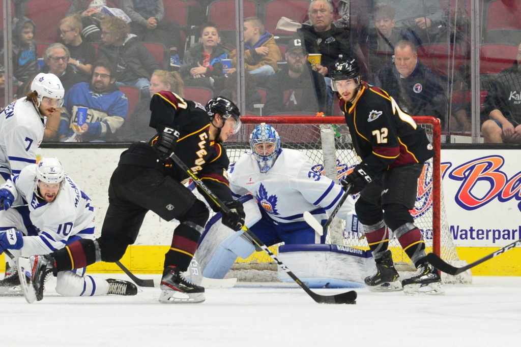 Ben Harpur opened the scoring at 14:25 of the first period, kickstarting a scoring frenzy with his first of the season. Pontus Aberg and Darren Archibald assisted on the opening goal. 30 seconds after Harpur’s goal, Nic Petan launched a one-timer from the point to put the Marlies ahead 2-0. Kristians Rubins and Aberg picked up the assists on Petan’s ninth of the season. 13 seconds after Petan’s goal, Cleveland’s Derek Barach brought the home crowd to their feet, getting the Monsters on the board and cutting the Marlies’ lead in half. 19 seconds after Cleveland’s goal, Tanner MacMaster tapped one in from the side of the goal to restore the Marlies’ two-goal lead. Garrett Wilson and Mac Hollowell assisted on MacMaster’s ninth of the season. The Marlies’ three goals in one minute chased Veini Vehvilainen from between the pipes as Matiss Kivlenieks entered the game in relief. Again, the Monsters were quick to respond and closed the gap with just over a minute remaining in the period. Toronto had an 11-10 edge in shots on goal in the opening 20 minutes and held a one-goal lead heading into the first intermission.